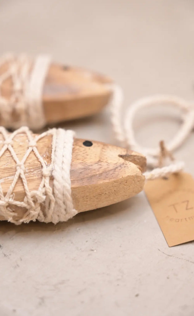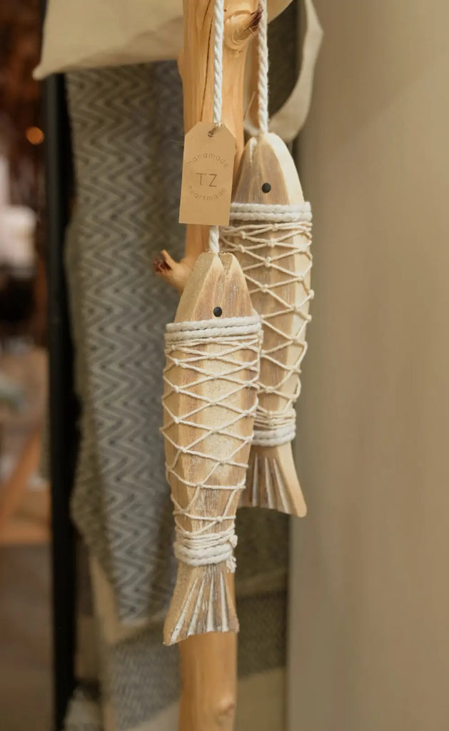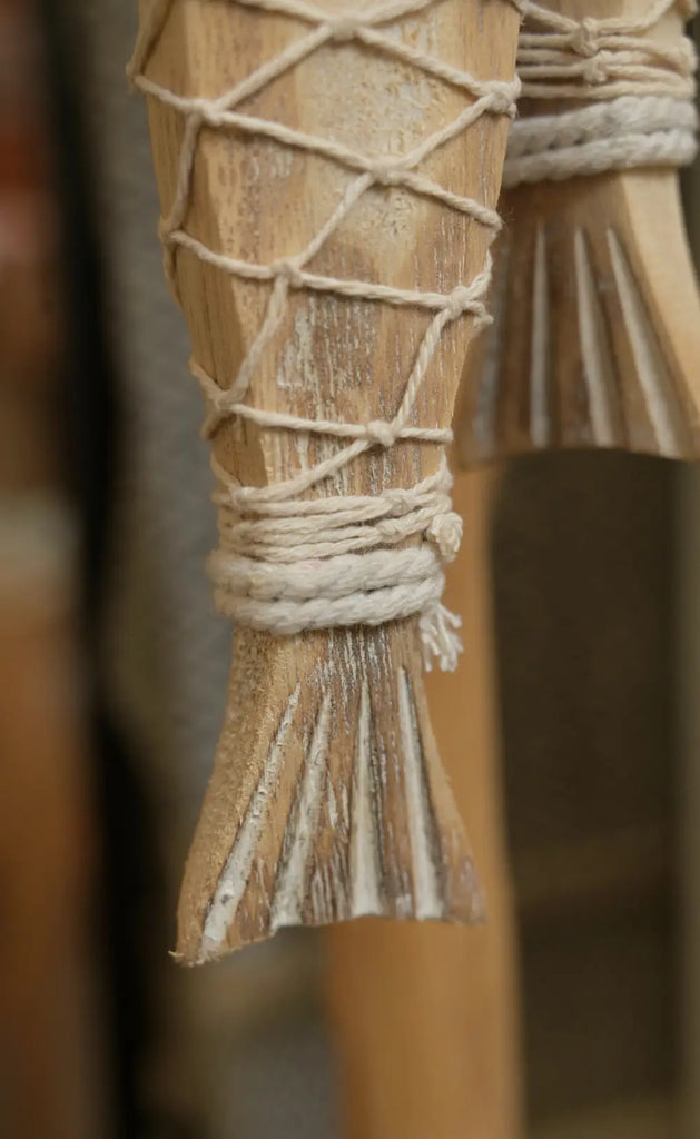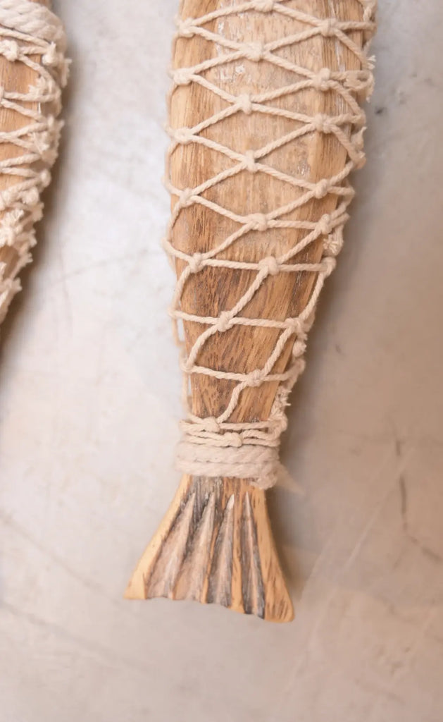 Un símbolo de buena fortuna hecho arte. El Decorativo Abundante presenta dos peces tallados en madera natural, unidos por un cordón y envueltos en una red tejida con hilo de algodón. Esta pieza representa la abundancia y está pensada para traer energía positiva a tu hogar.