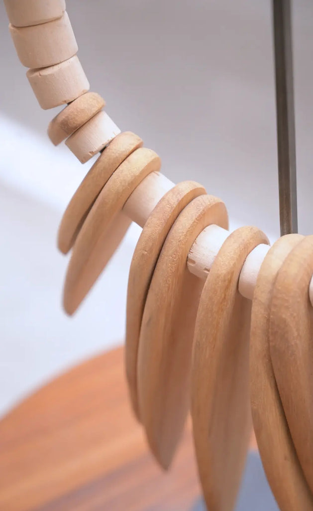 El alma de los detalles. El Decorativo Bone es un collar tribal hecho a mano con piezas de madera tallada en tonos negro y beige, montado sobre una estructura metálica. Su diseño escultural lo convierte en un punto focal para cualquier espacio, ideal para hogares, hoteles o negocios que buscan un toque distintivo y auténtico.