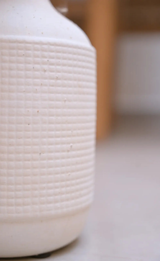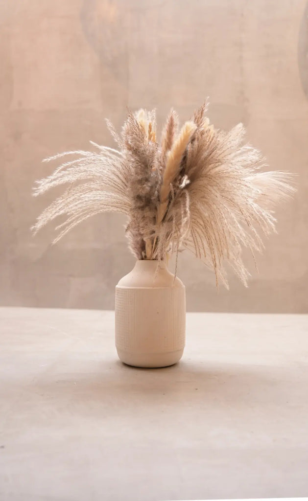 Funciona como florero o simplemente como acento decorativo, integrando texturas naturales a tu espacio con un diseño atemporal y acogedor.