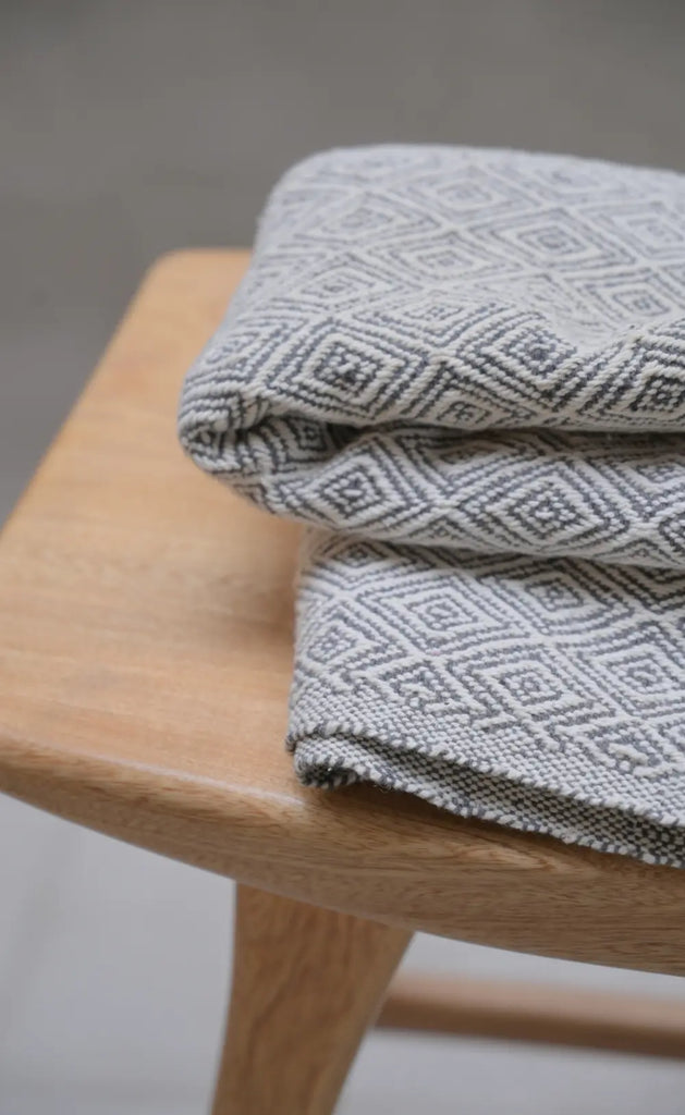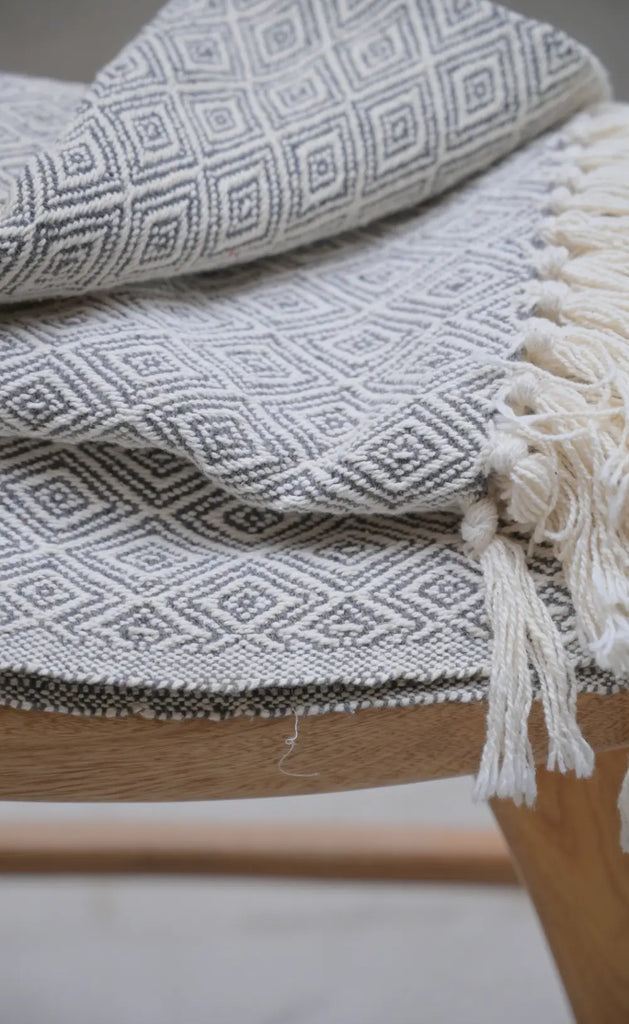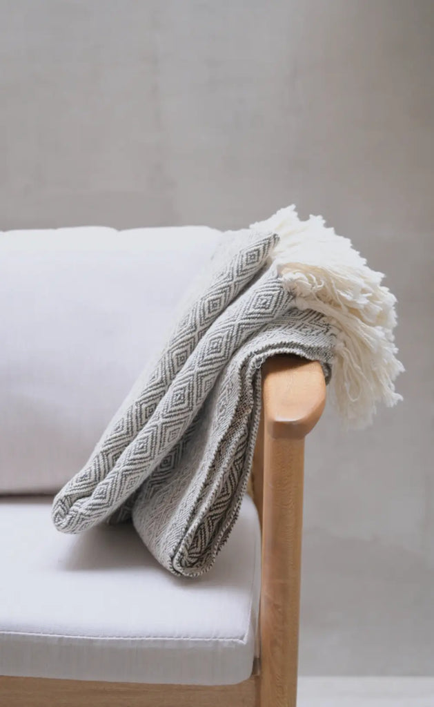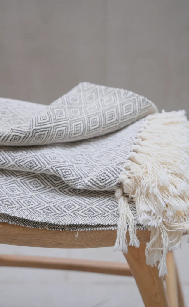 Frazada artesanal 100% algodón en tonos crudo y gris. Ligera, cálida y decorativa.