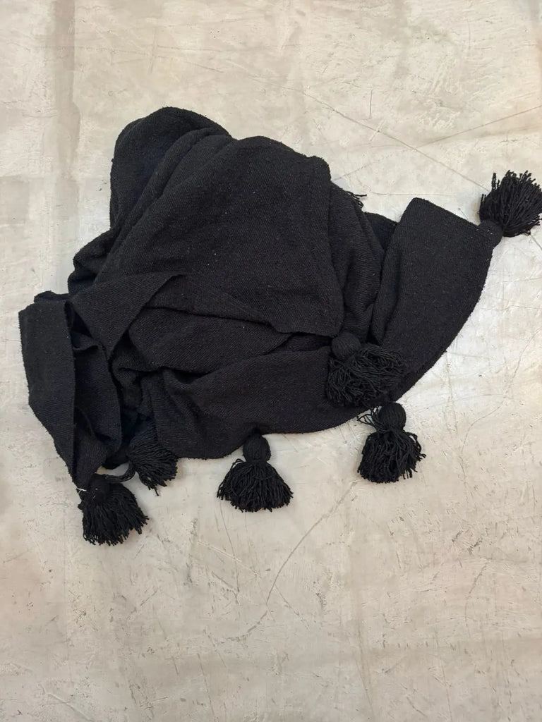 Envuélvete en suavidad con la Frazada Isabel. Hecha de mezcla de fibras de algodón, lana y sintéticas con detalles de pompones de lana, esta pieza combina confort, textura y estilo atemporal. Su tono negro se adapta fácilmente a cualquier espacio, aportando mucha elegancia a tu espacio.