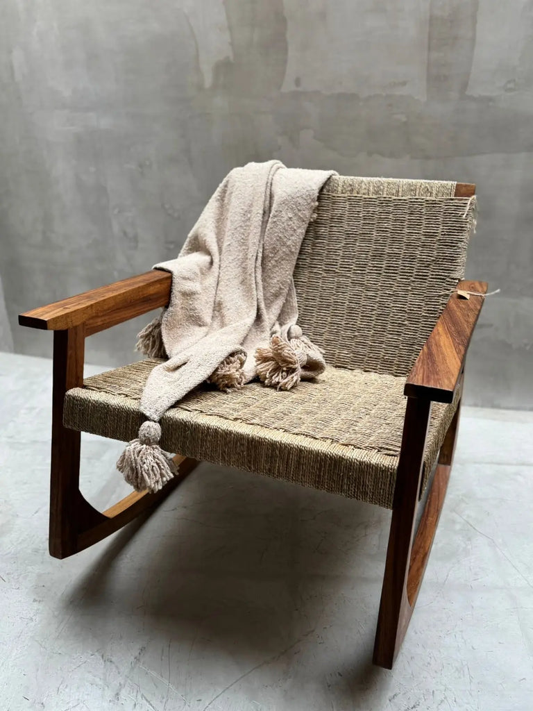 ¡Increíble! Super cómoda y elegante. Mecedora artesanal de madera de parota con alga marina. Cálida, firme y relajante.
