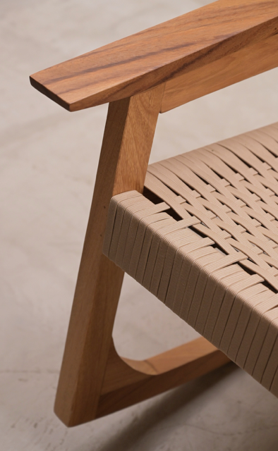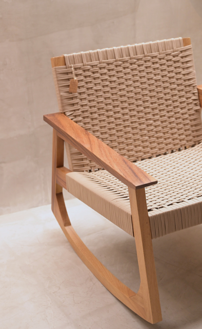 Mecedora artesanal de madera de parota con tejido de hilo de polipropileno. Cálida, firme y relajante.