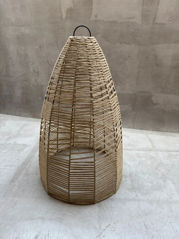 ¡Elegancia artesanal! Tejida a mano en yute natural sobre una estructura de metal, permitiendo una iluminación envolvente y decorativa. Su diseño neutro pero sofisticado se adapta a interiores modernos, bohemios o naturales.