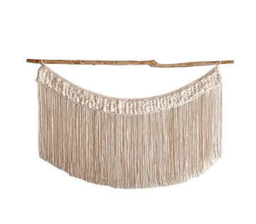 Macramé decorativo de hilo de algodón con colgante de madera. Hecho a mano, elegante y perfecto para vestir tus muros con textura.