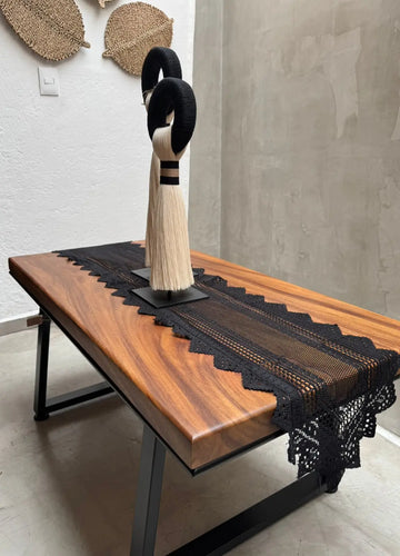 ¡Tienes que tenerlo! Su diseño artesanal pero elegante, destaca ante cualquier otro modelo; esta tejido a mano por artesanos mexicanos en encaje negro, cuidando cada detalle. Tu mesa se verá increíble al colocarle este camino de mesa.