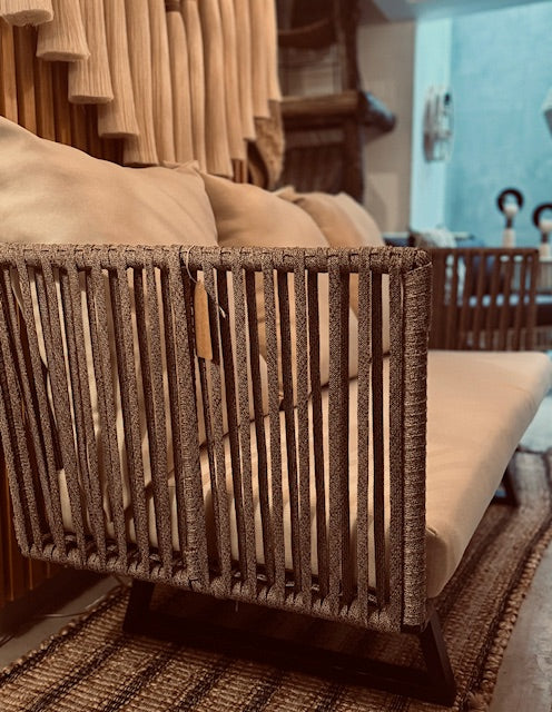 Sillón triple artesanal con estructura de metal, tejido en nylon resistente al sol y al agua, incluye cojinería de tela exterior. Ideal para interiores o exteriores techados.