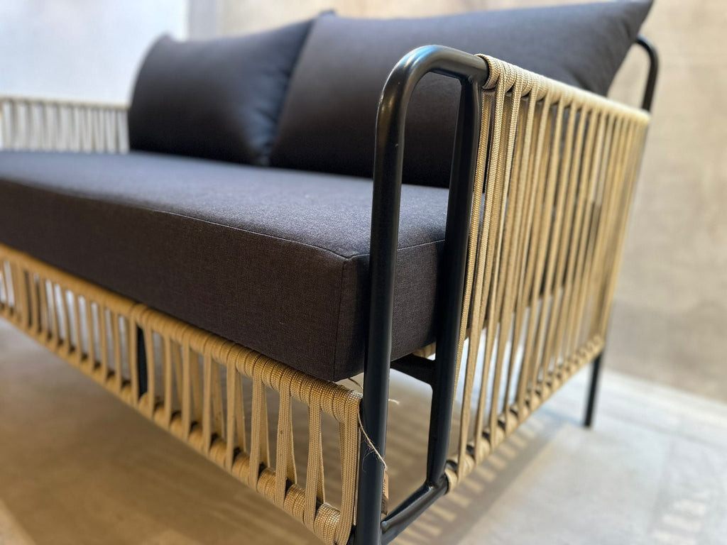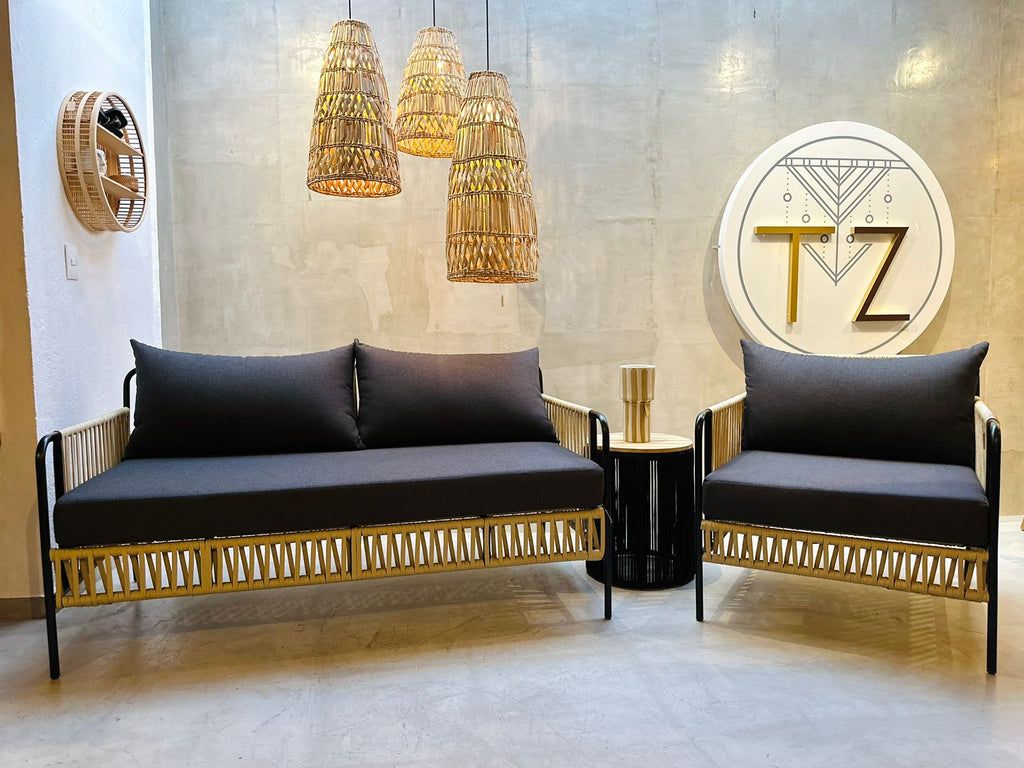 Sillón Chetumal 2 Plazas, ¡uno de nuestros consentidos!, por su elegancia, comodidad y su diseño, simplemente increíble. Esta elaborado por artesanos mexicanos, tejidos sobre una estructura de metal negra con cuerda de nylon para exterior techado por lo que puedes colocarlo en la terraza de tu casa, negocio, etc.