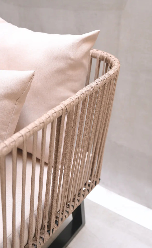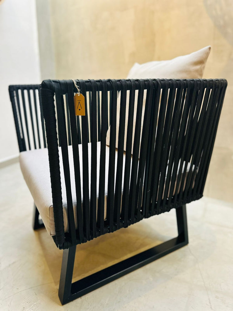 Sillón artesanal con estructura metálica negra, tejido en cuerda de nylon resistente al agua y calor, incluye cojinería en tela de exterior. Perfecto para interiores o exteriores techados.
