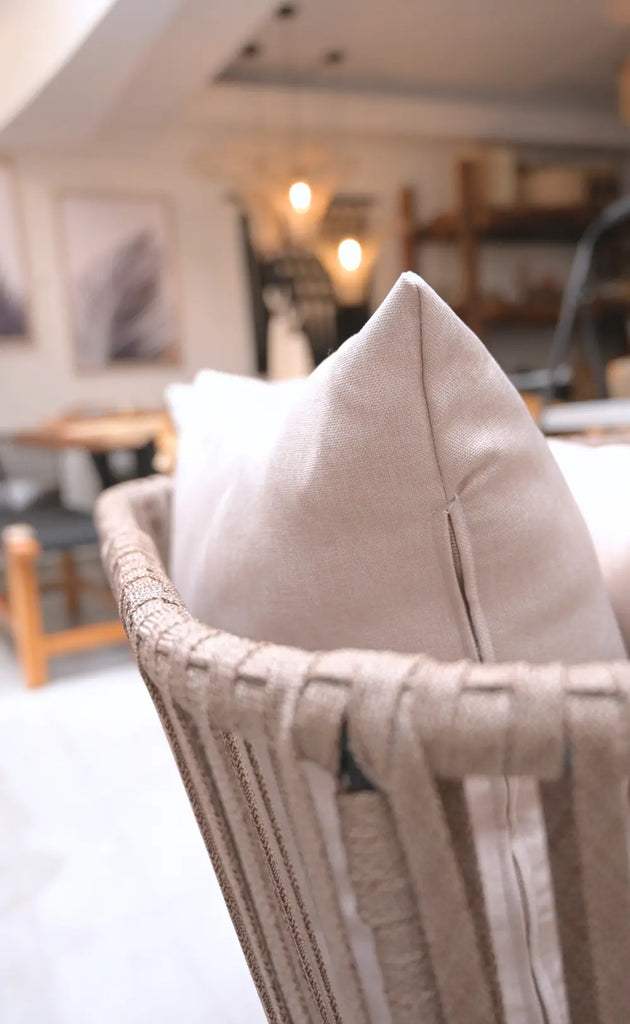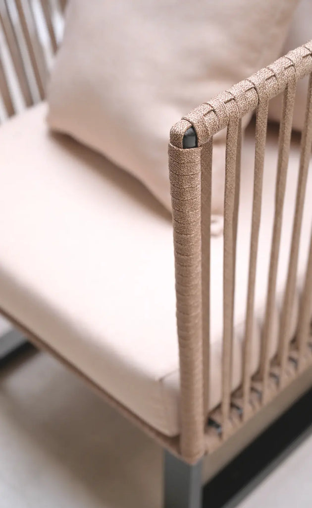 El Sillón Holbox es un clásico de Tzala. Tejido a mano por artesanos mexicanos, combina una estructura de metal negro con cuerda de nylon de alta resistencia—perfecta para exteriores. Su diseño envolvente y la cojinería en tela de exterior te invitan a sentarte, relajarte y olvidarte del tiempo. Es ideal para terrazas, jardines techados o interiores con estilo.