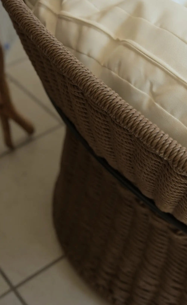 Con una estructura metálica robusta y tejido artesanal en cuerda de nylon resistente al sol y al agua, esta pieza ofrece una comodidad inigualable. Incluye cojinería acolchada (lavable), pensada para darte ese momento de calma que tanto necesitas.