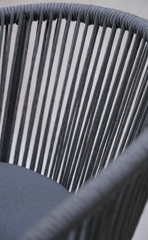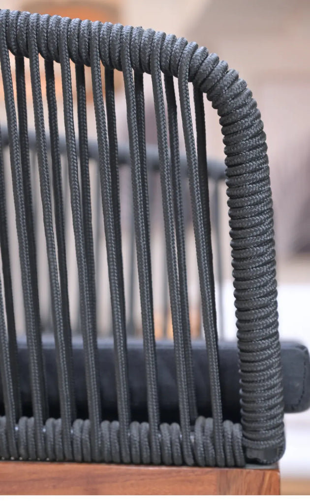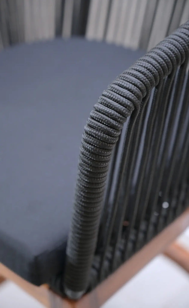 El tejido aporta textura y contraste visual, mientras que el cojín integrado en el asiento suma confort. Una pieza resistente, versátil y estéticamente equilibrada para espacios que buscan carácter.