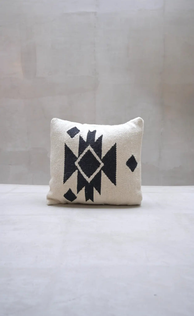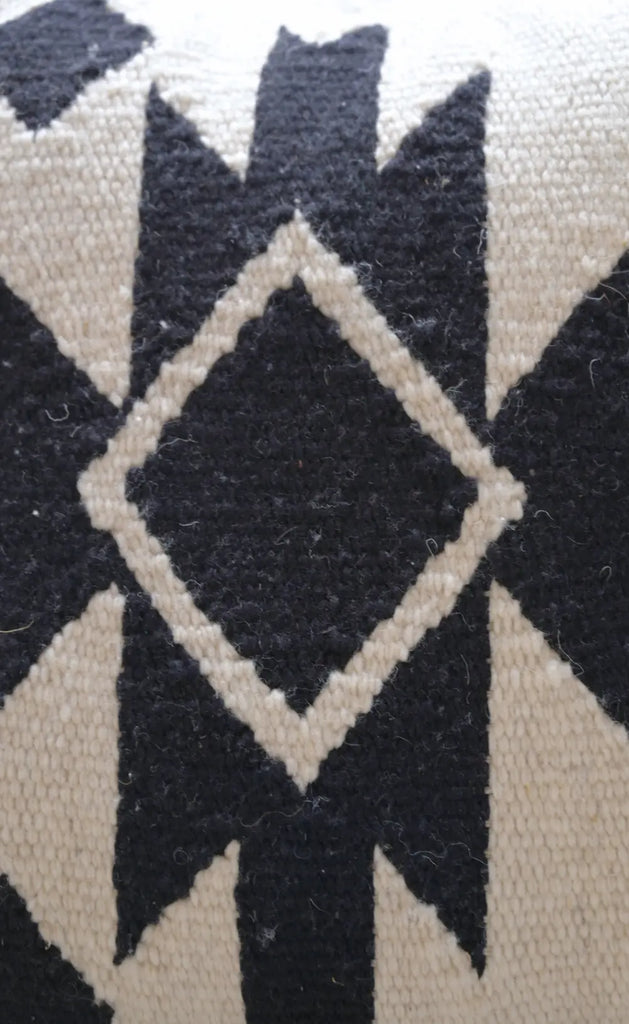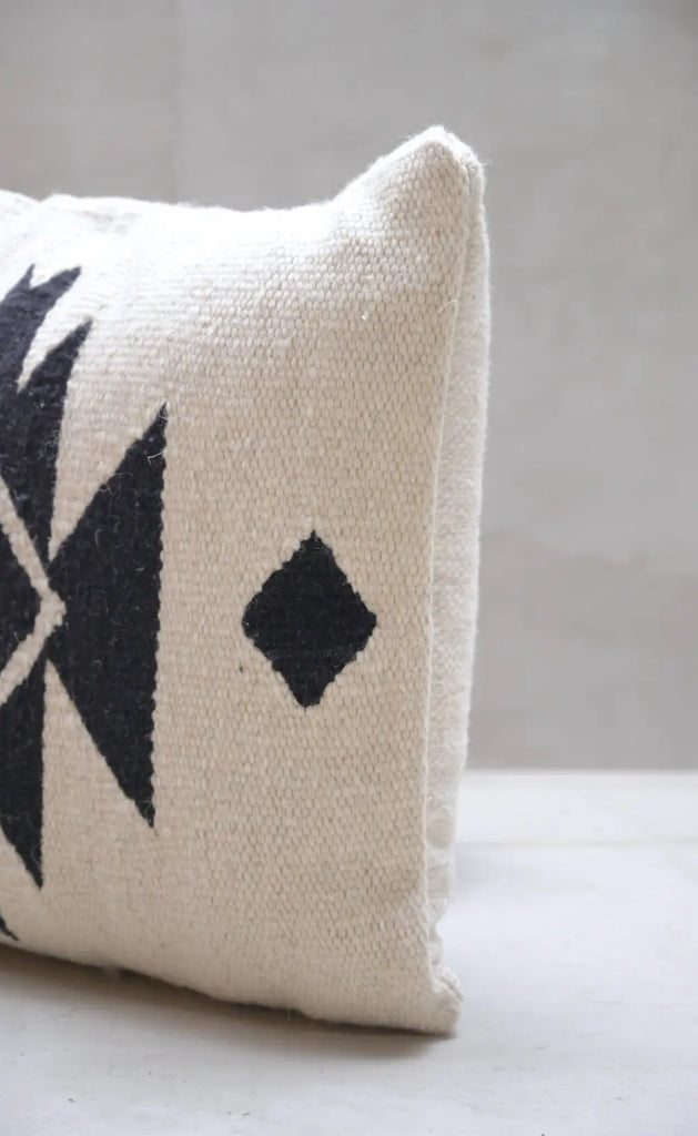 Cojín decorativo de lana con relleno de espuma. Blanco crudo con grecas negras. Elegante, artesanal y suave.
