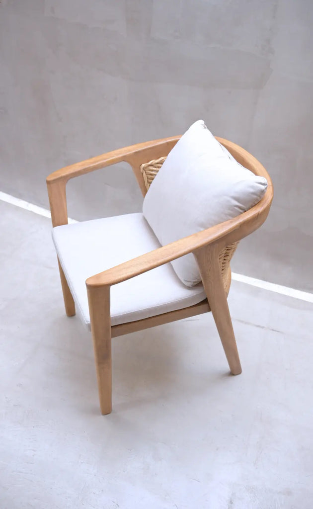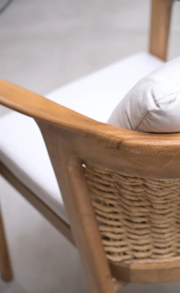 Diseño sofisticado con alma natural. La Silla Tulum está elaborada con estructura de madera rosa morada y un respaldo tejido a mano en hilo de polipropileno de alta resistencia, imitación rattan. Su forma ergonómica y la calidez de sus materiales la convierten en la pieza ideal para comedores, salas o espacios de descanso interior.