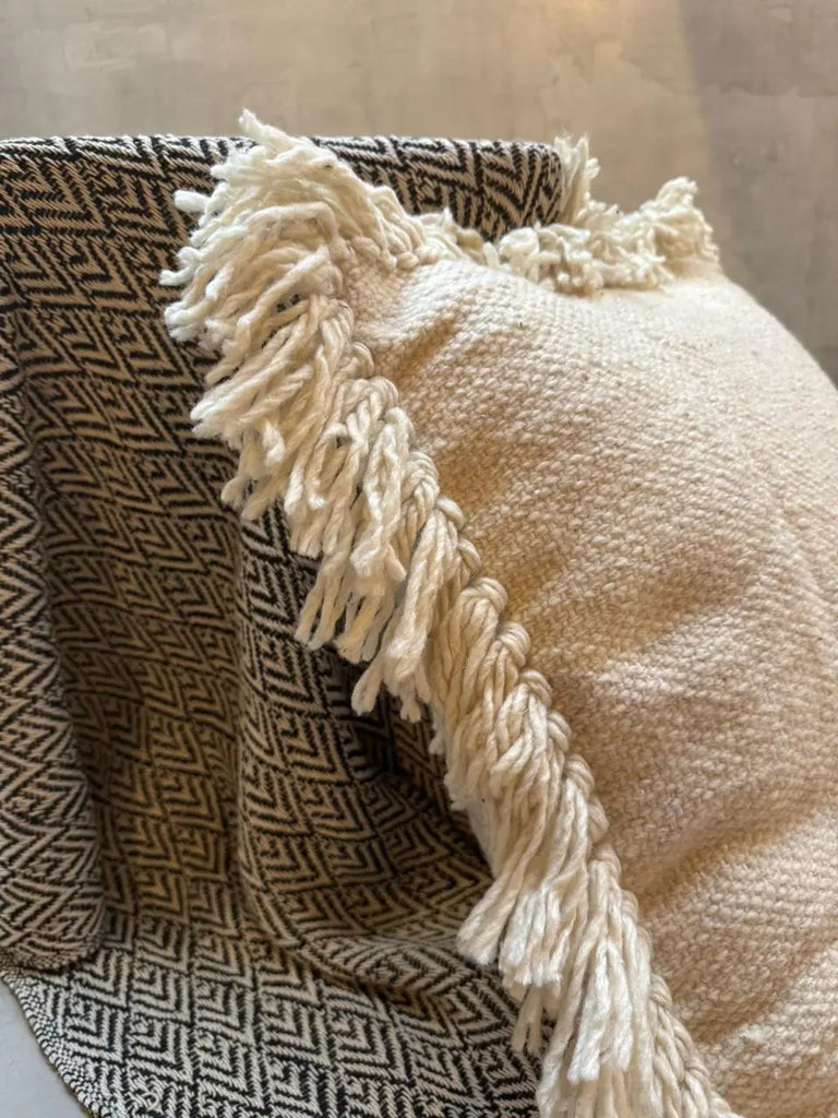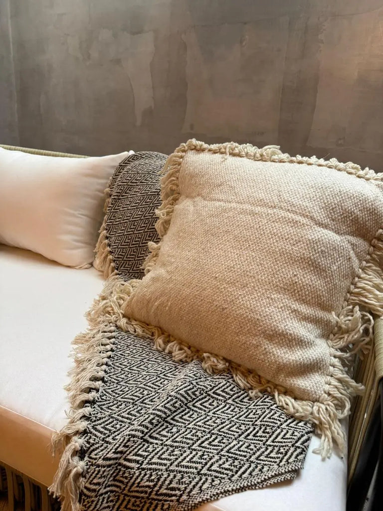 Hecho a mano en México con forro de 100% lana y relleno de espuma. Su diseño en blanco crudo lo convierte en un acento visual versátil que combina con todo.