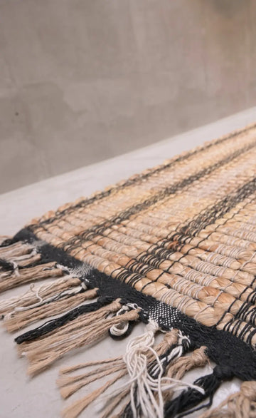 El Tapete Andie es sinónimo de elegancia moderna. Tejido a mano con yute natural e hilos de algodón blanco y negro, este tapete ofrece textura, estilo y autenticidad artesanal. El detalle de los pompones en los extremos le da un acabado distintivo y decorativo.