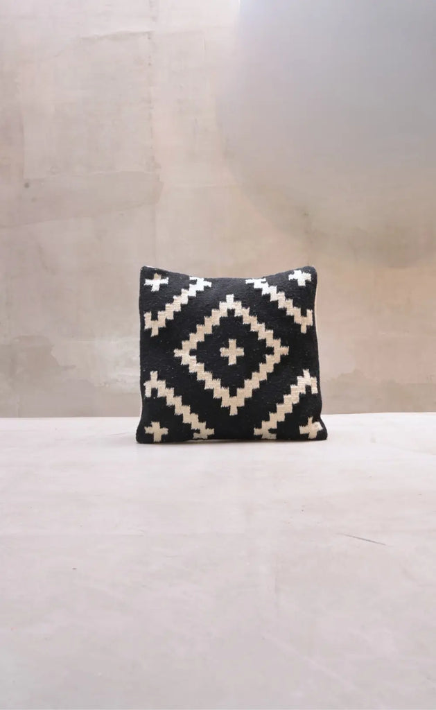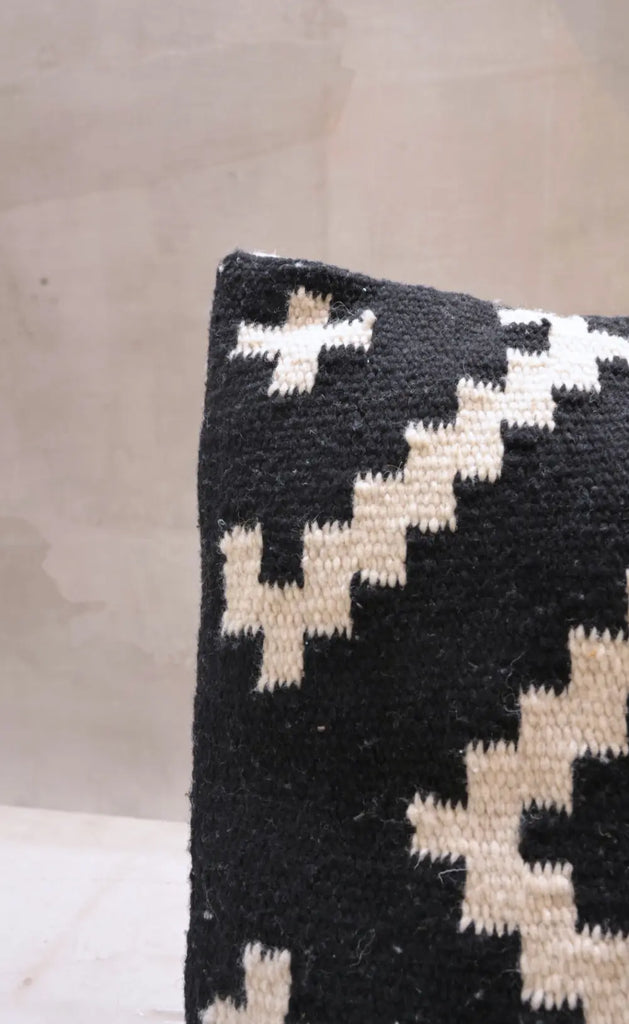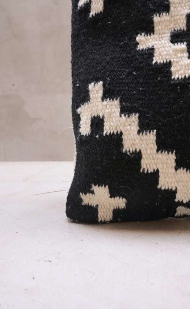 Textura, tradición y diseño en una sola pieza. El Cojín Rosario está hecho a mano en México con forro 100% lana y relleno de espuma, combinando suavidad, calidez y un diseño geométrico en blanco y negro que añade carácter a cualquier espacio.