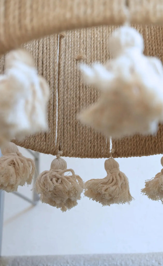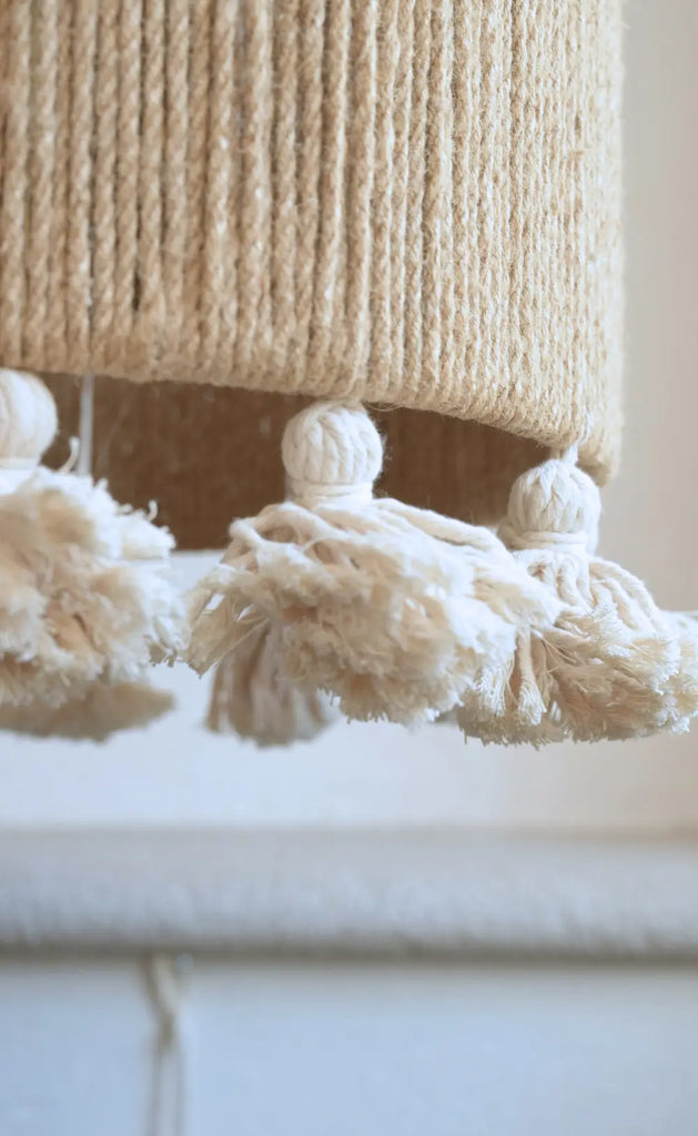 Una pieza verdaderamente especial. La lámpara Pichilingue es una joya decorativa hecha a mano con una mezcla de yute natural, hilo de algodón blanco, pompones y beats de madera. Su diseño bicolor la hace destacar como un elemento artesanal contemporáneo que aporta carácter y calidez a cualquier espacio.