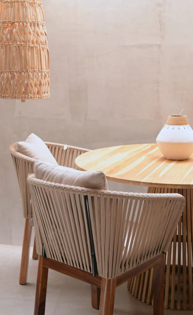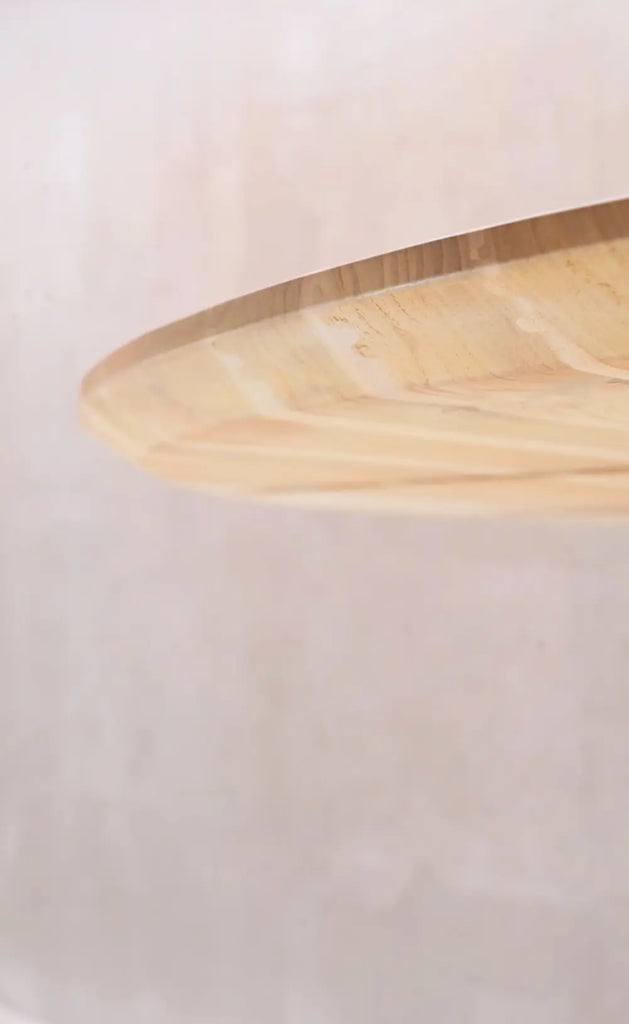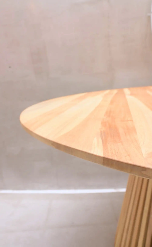 Mesa redonda de madera Teka, perfecta para comedores, con diseño moderno ya que su base es cónica, la superficie redonda fomenta la conversación y la convivencia de tus invitados.