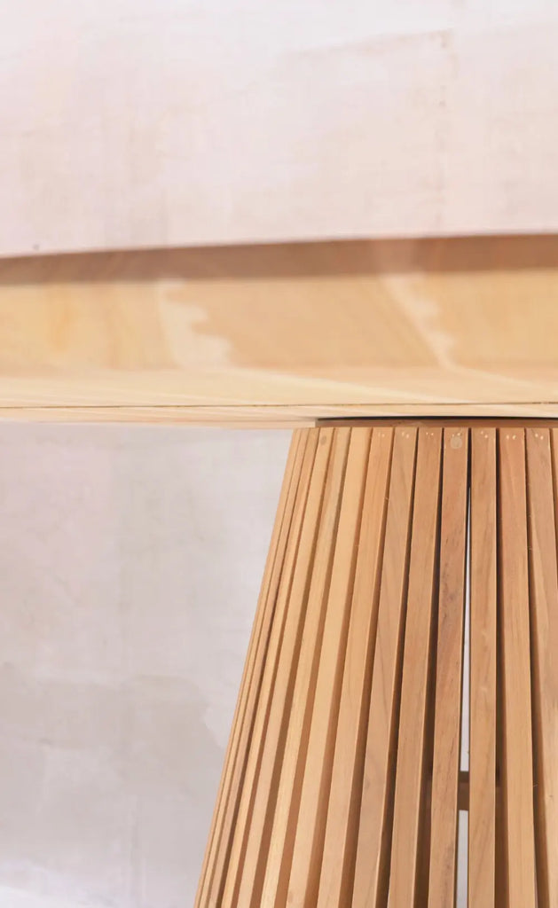Mesa redonda de madera Teka, perfecta para comedores, con diseño moderno ya que su base es cónica, la superficie redonda fomenta la conversación y la convivencia de tus invitados. La madera Teka es 100% para exterior, así que podrás colocarla en tu terraza, jardín o junto a la alberca.