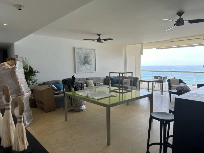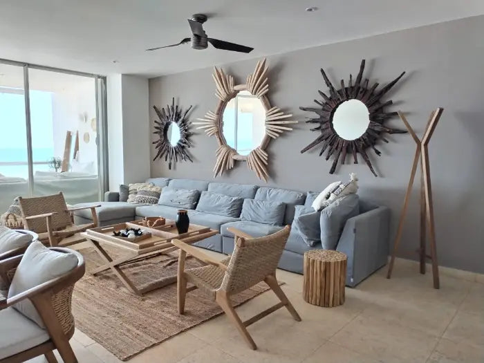 Para el proyecto de ShowRoom Acapulco se hizo una minuciosa selección de mobiliario, para que los colores, texturas y materiales definieran un estilo unico, boho, playero, chic y vanguardista como lo es Tzala.