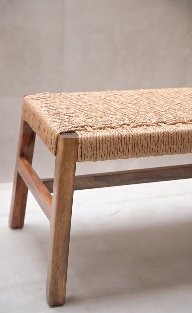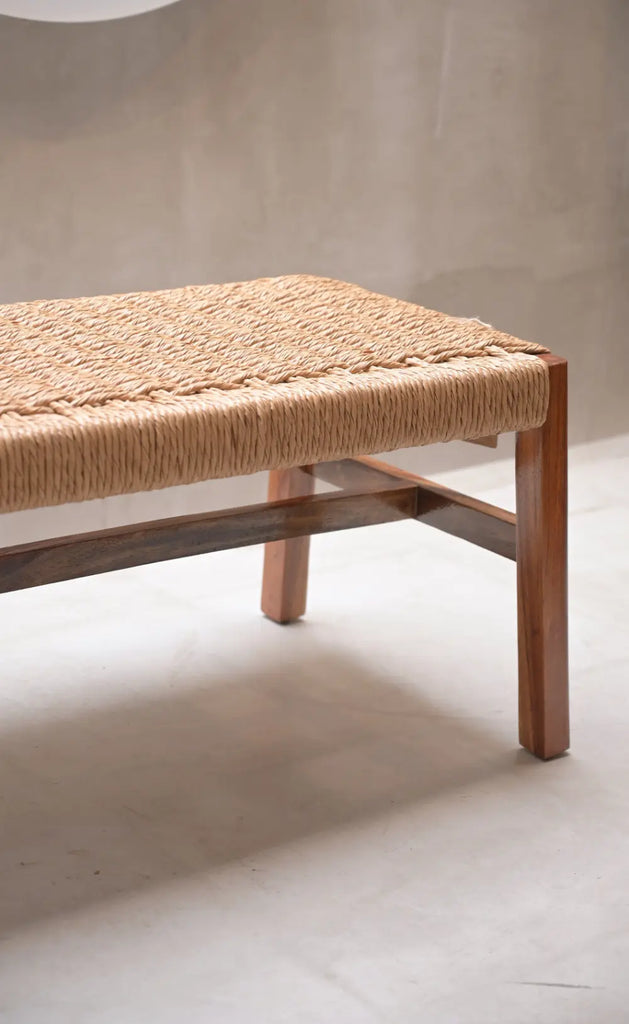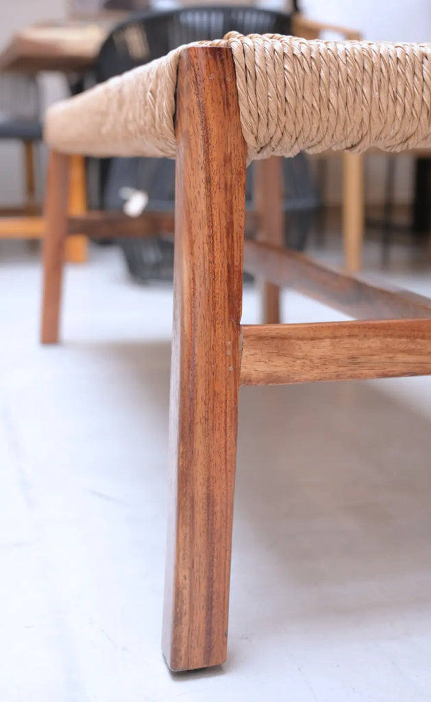 La Banca Rosarito combina belleza artesanal y funcionalidad cotidiana. Hecha de madera rosa morada barnizada y con un tejido de hilo sintético de nylon en tono café veteado, es una pieza firme y duradera que se adapta a cualquier espacio del hogar. Su textura recuerda al trenzado tradicional de palma, pero con la resistencia de los materiales contemporáneos.