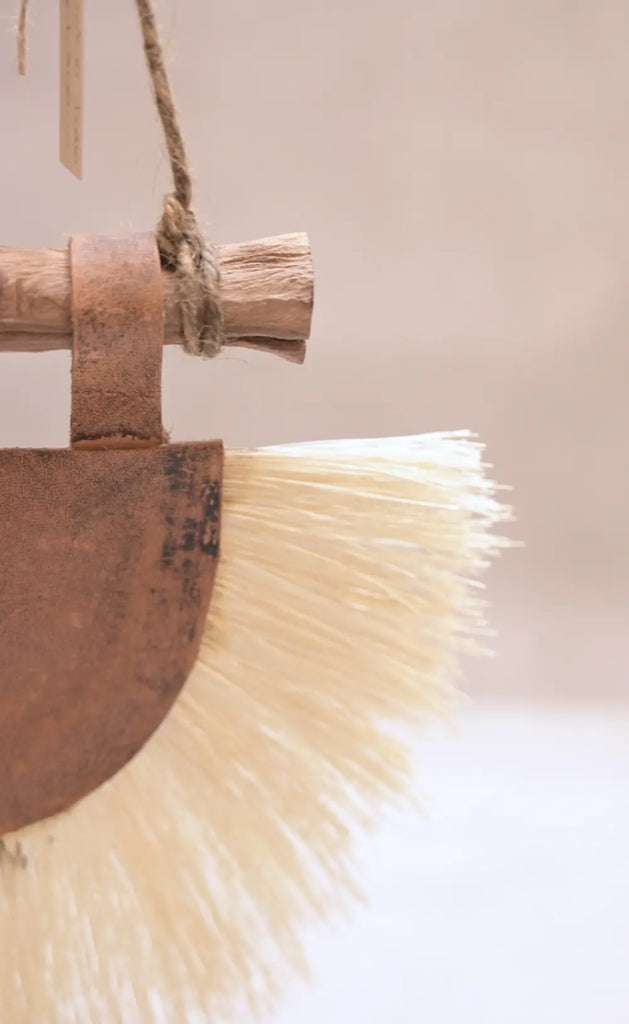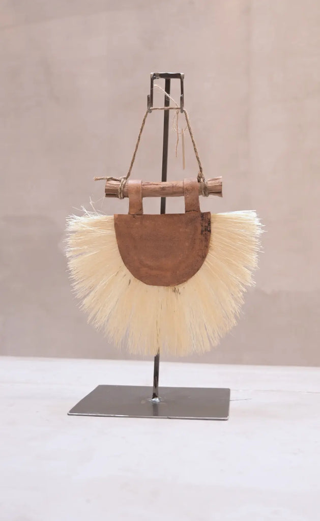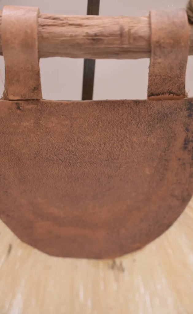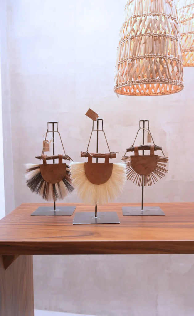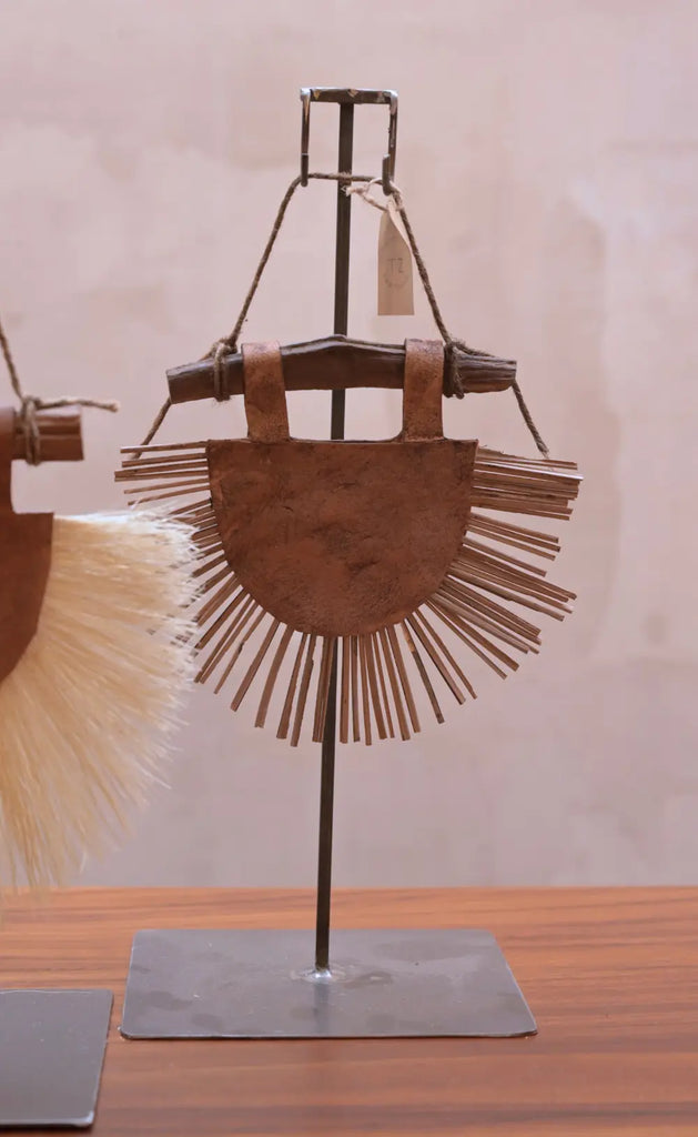 Decorativo artesanal de fibra de agave, cuero y estructura metálica. Hecho a mano, con diseño natural.